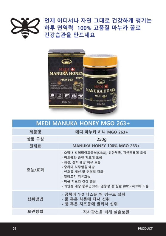 자연의 선물로 여겨지는 "마누카 꿀 100% MGO 263+"는 장 건강을 지원하고 면역력을 높여 하루를 건강하게 시작할 수 있도록 도와줍니다.
