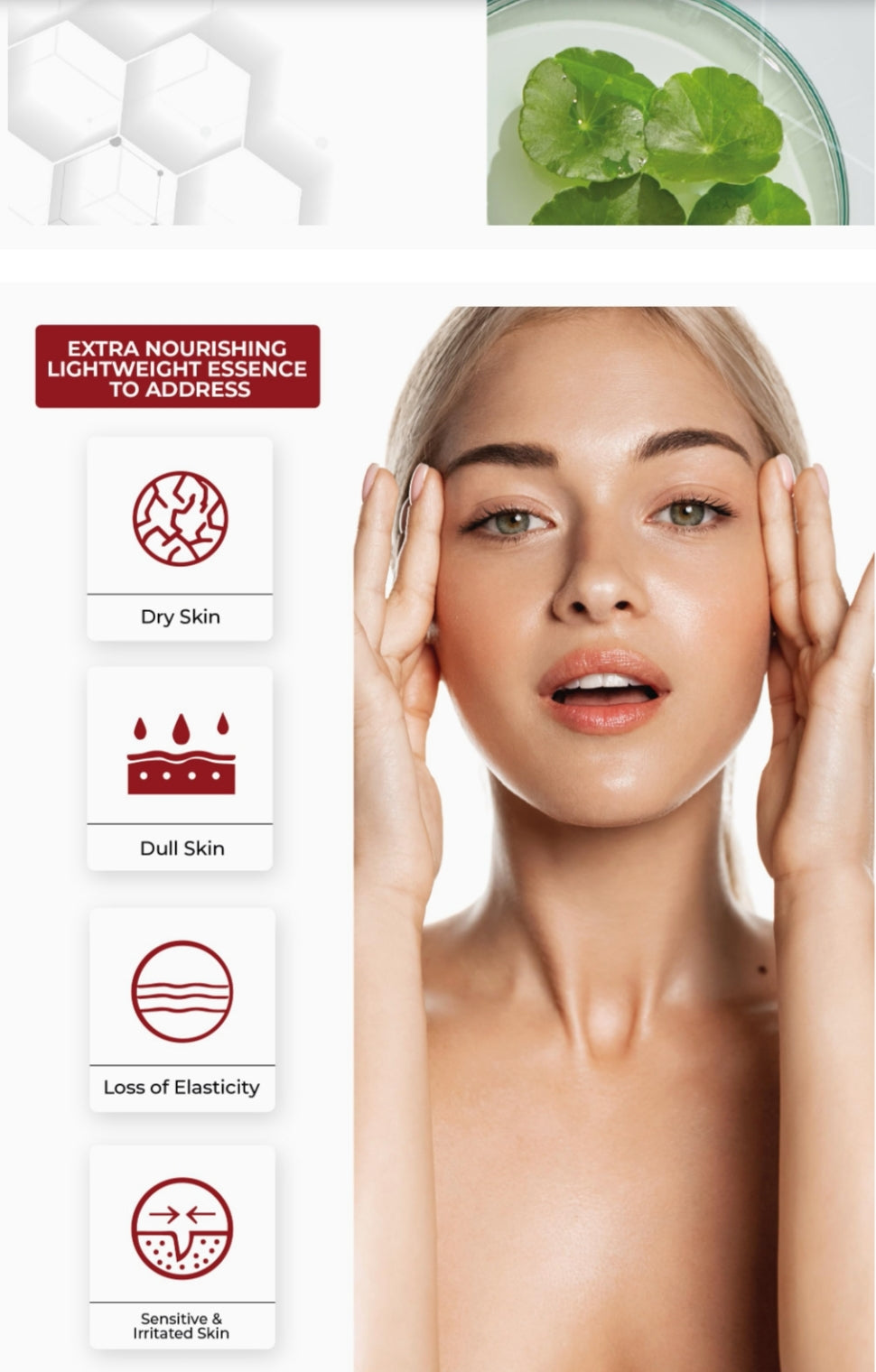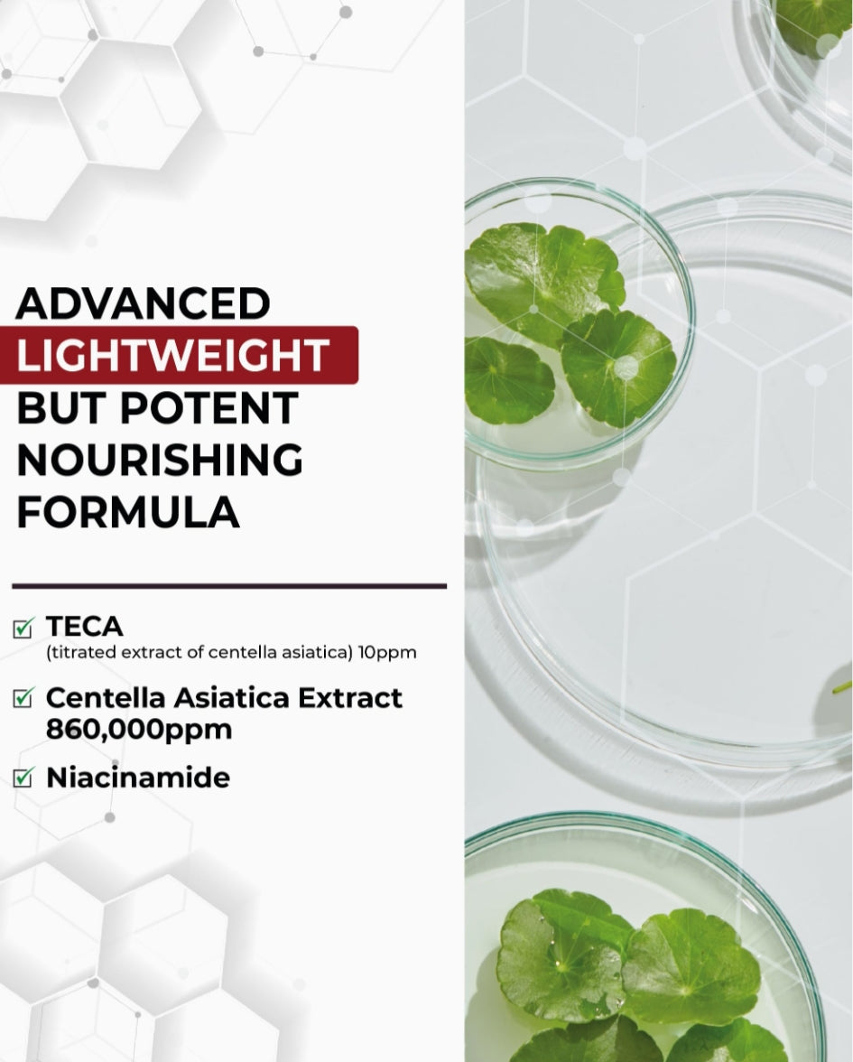 860,000 ppm of Centella Asiatica extract, 10 ppm of TECA (titrated extract of Centella Asiatica), and Niacinamide work together to help illuminate and clarify complexion, while providing intense hydration and nourishment to the skin.