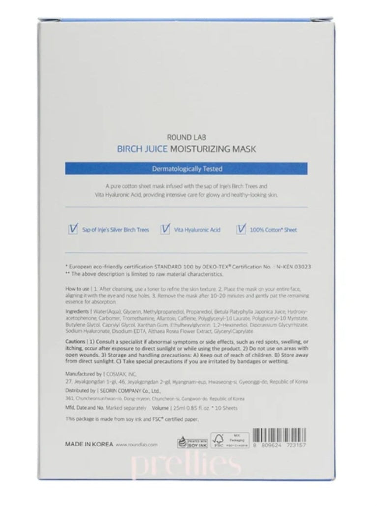 The Round Lab Birch Juice Moisturizing Mask Sheet contains the benefits of an ampoule to intensely deliver moisture to skin. Richly infused with Birch Juice, which has a special ability to reduce inflammation, purifies and hydrates skin with 17 amino acids, minerals, antioxidants and vitamins. Hyaluronic Acid is also present to keep skin moisturized, while caffeine depuffs and improves circulation to protect skin from damage caused by free radicals. Delivered though a 100% pure cotton sheet mask made with no chemical additives and allows the formula to be absorbed effectively into skin without irritation.