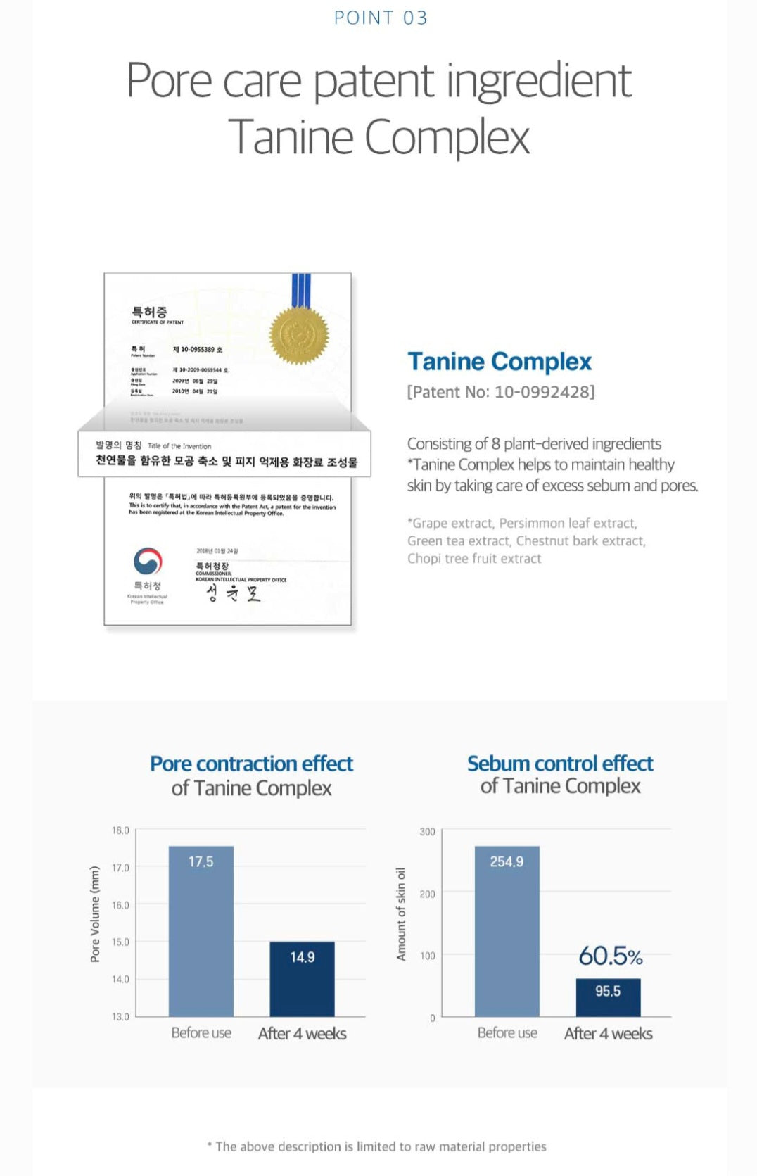 Contains birch tree sap ingredient and patent ingredient Tanine Complex to hydrate skin and provide pore and sebum care effect.