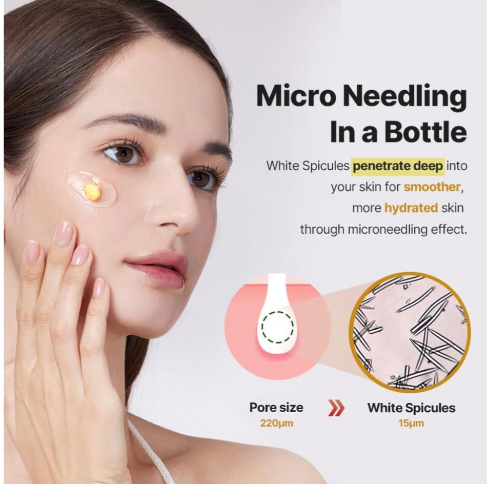 The gel base is infused with eight types of hyaluronic acid and panthenol, delivering lasting hydration and a revitalised glow. What sets this cream apart is its white spicule technology, boasting up to 150,000 micro-needling spicules smaller than your pores, allowing potent ingredients to penetrate deeply for improved absorption and long-term impact.