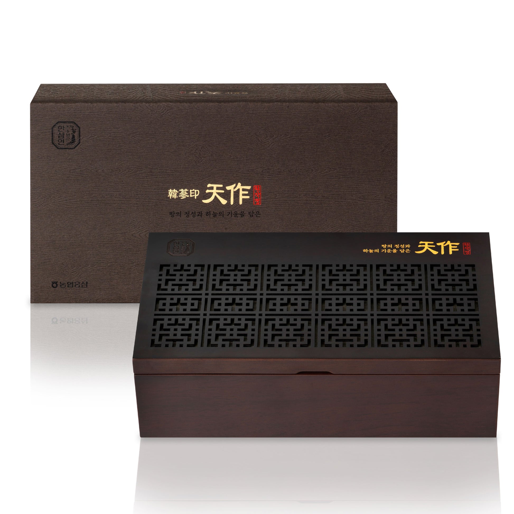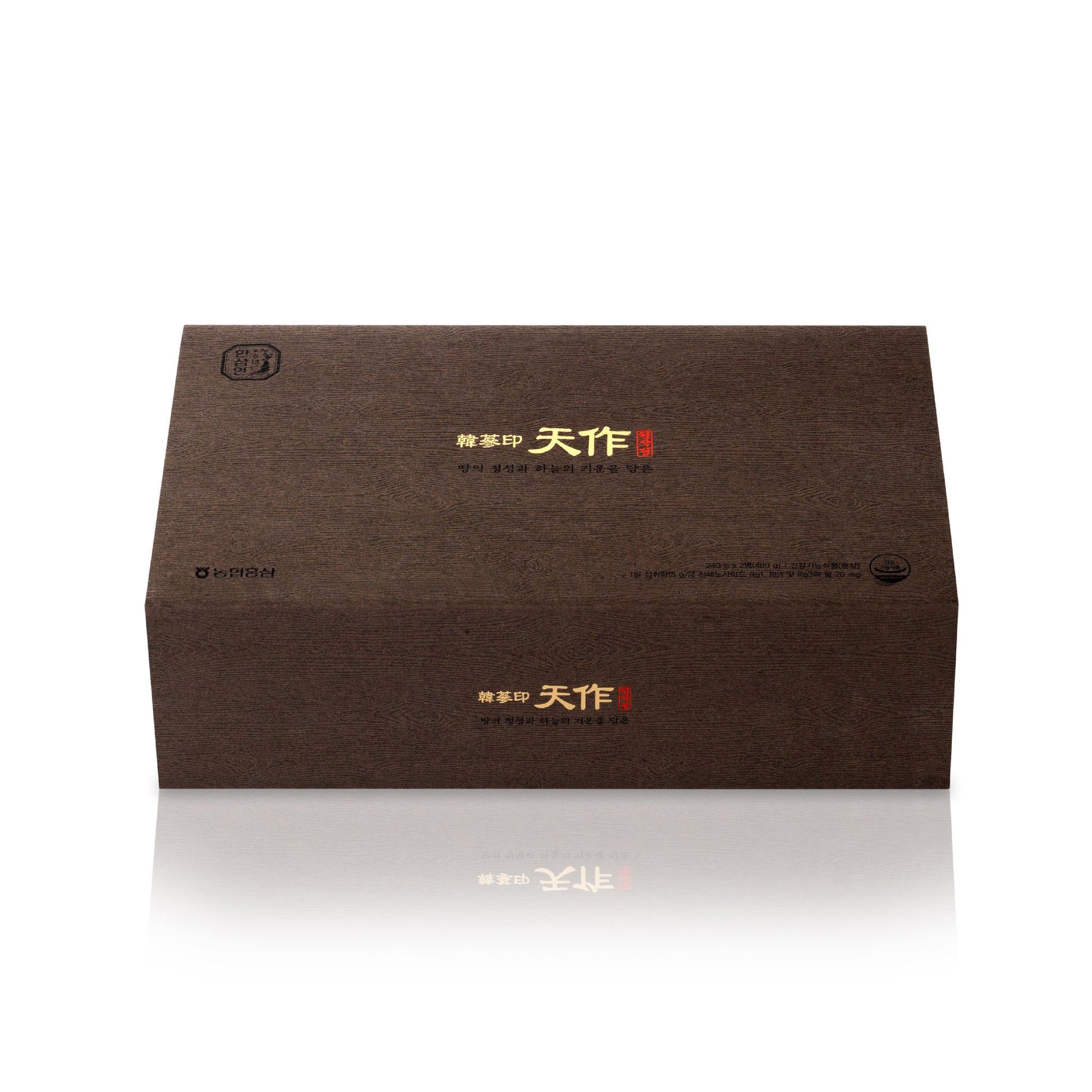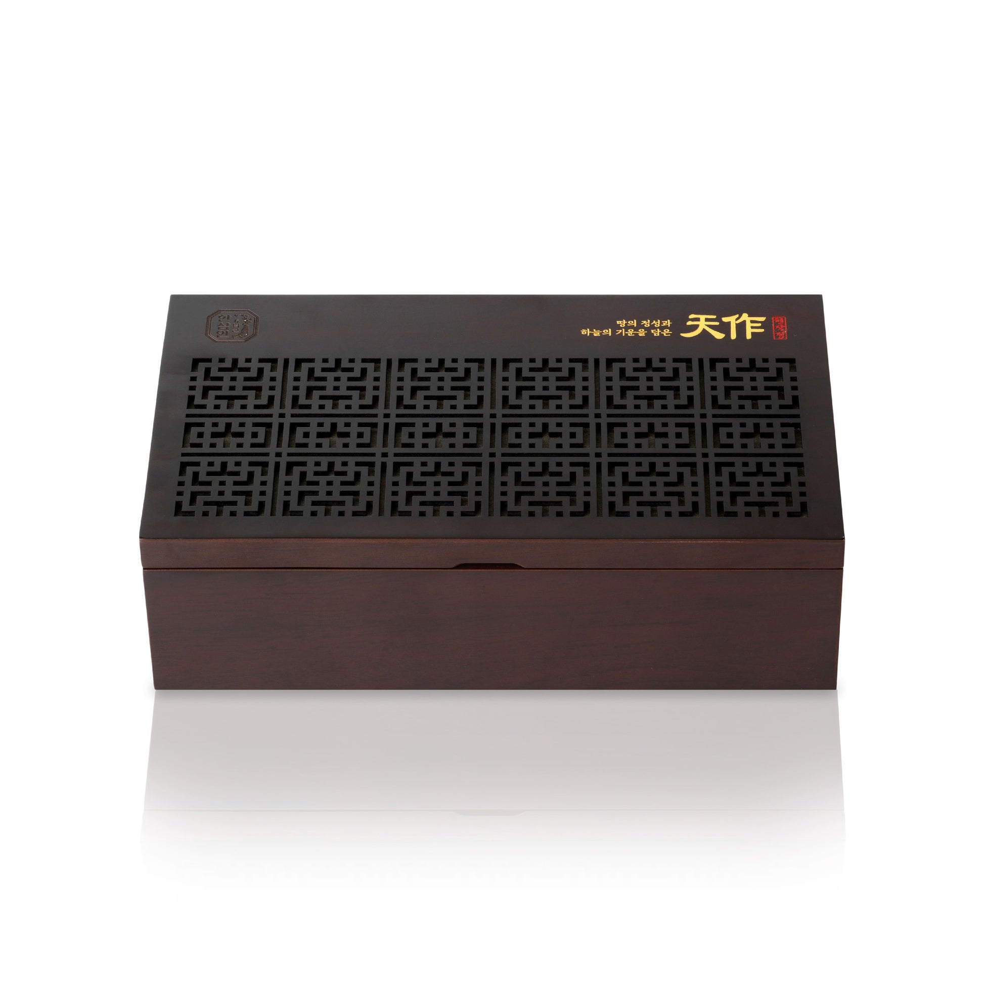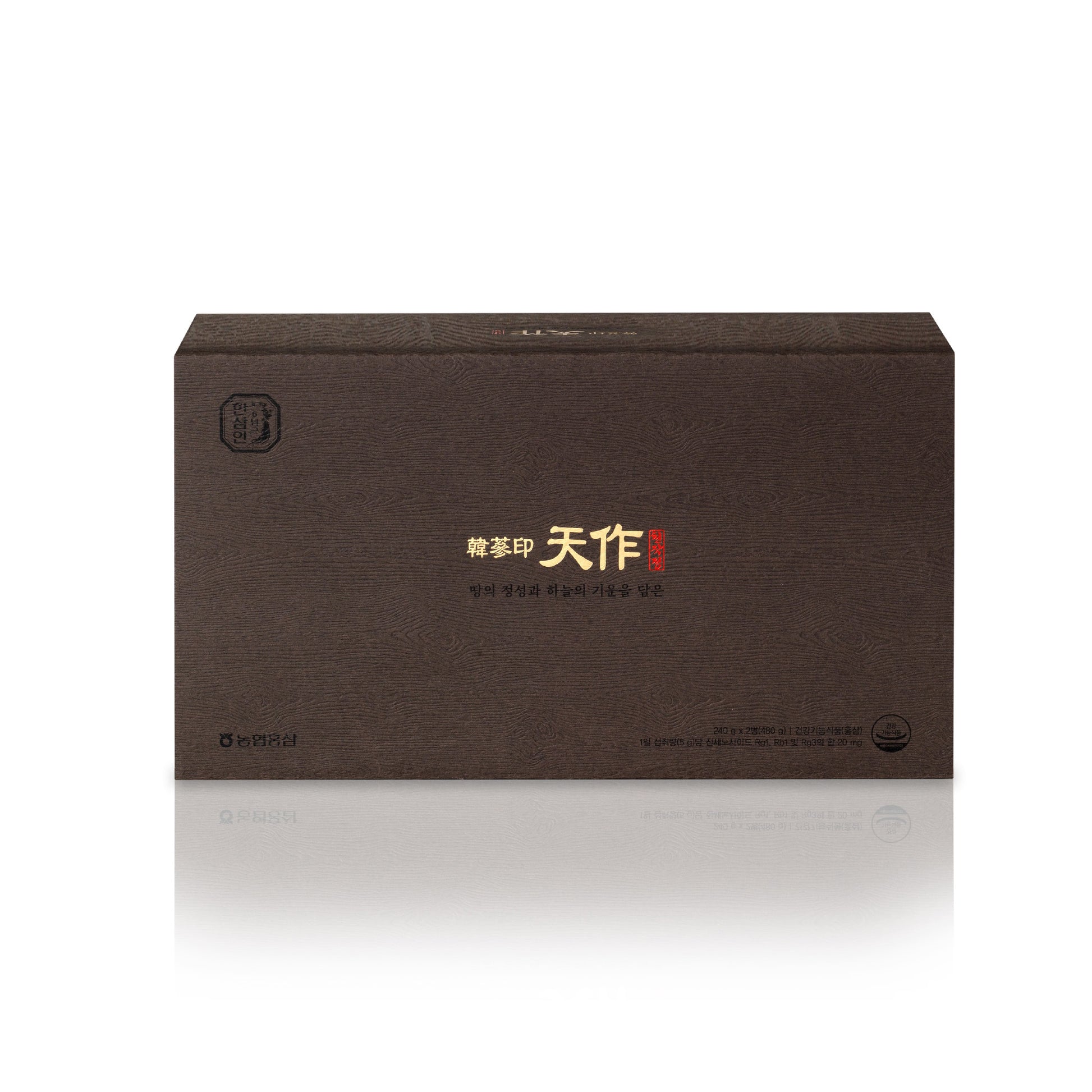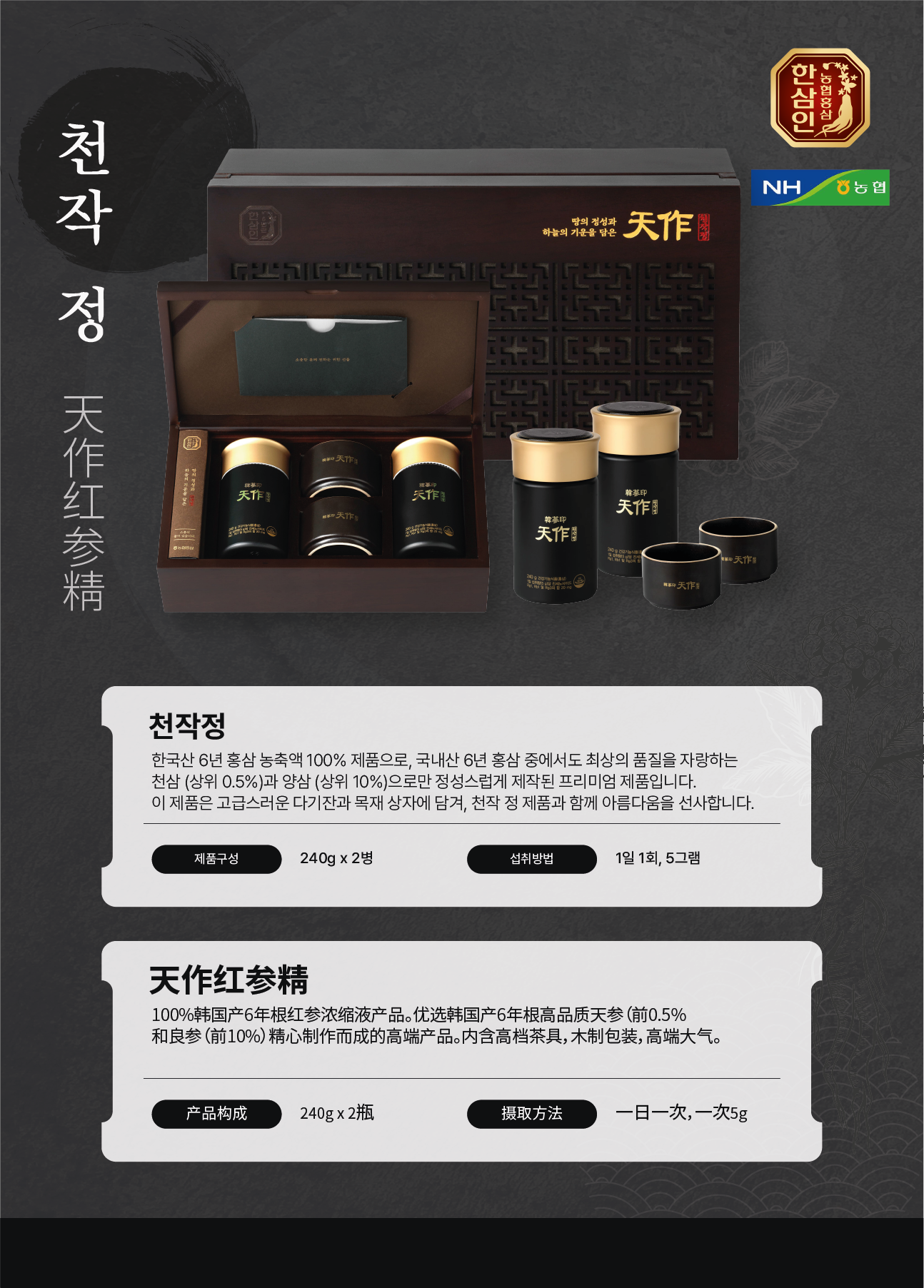한국산 6년 홍삼 농축액 100% 제품으로, 국내산 6년 홍삼 중에서도 최상의 품질을 자랑하는 천삼 (상위 0.5%)과 양삼 (상위 10%)으로만 정성스럽게 제작된 프리미엄 제품입니다. 이 제품은 고급스러운 다기잔과 목재 상자에 담겨, 천작정 제품과 함께 아름다움을 선사합니다.