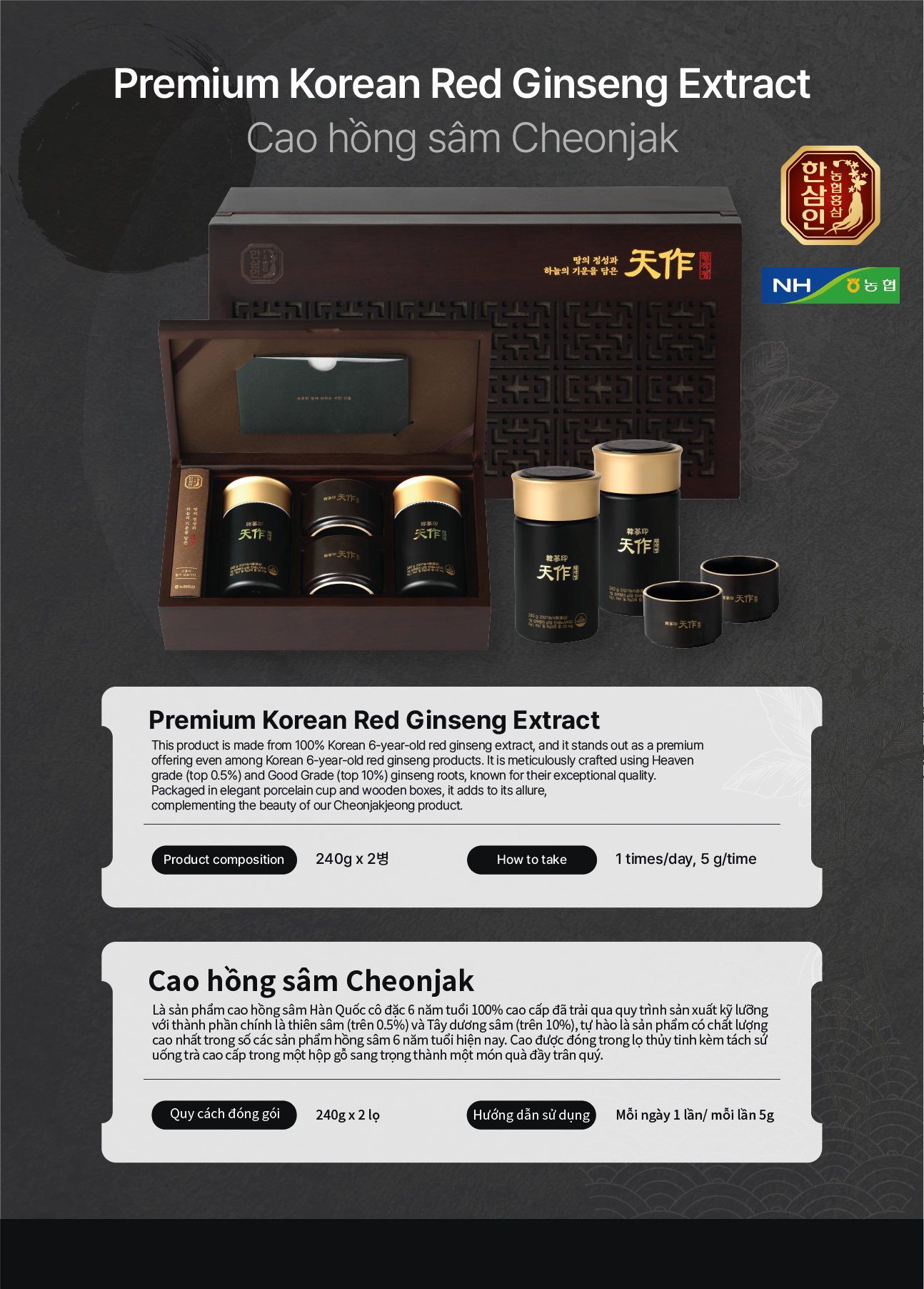 Là sản phẩm cao hồng sâm Hàn Quốc cô đặc 6 năm tuổi 100% cao cấp đã trải qua quy trình sản xuất kỹ lưỡng với thành phần chính là thiên sâm (trên 0.5%) và Tây dương sâm (trên 10%), tự hào là sản phẩm có chất lượng cao nhất trong số các sản phẩm hồng sâm 6 năm tuổi hiện nay. Cao được đóng trong lọ thủy tinh kèm tách sứ uống trà cao cấp trong một hộp gỗ sang trọng thành một món quà đầy trân quý.