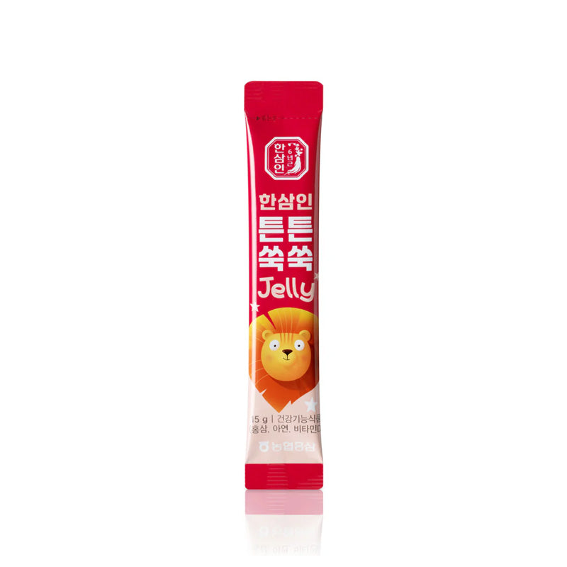 6년근 홍삼농축액과 아연, 비타민 D를 더해 유아들의 면역 건강과 성장에 도움을 주는 새로워진 농협 홍삼 한삼인 튼튼젤리. 국내산 6년근 홍삼 진세노사이드 6mg을 함유하고 있습니다.